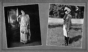 Tableaux on the Vista: In this photograph, ladies from the Literary Societies, in costumes and holding urns and laurels, depict a scene from a passage in Greek literature. Such silent and motionless scenes were common at the time. They called them tableaux or living pictures.