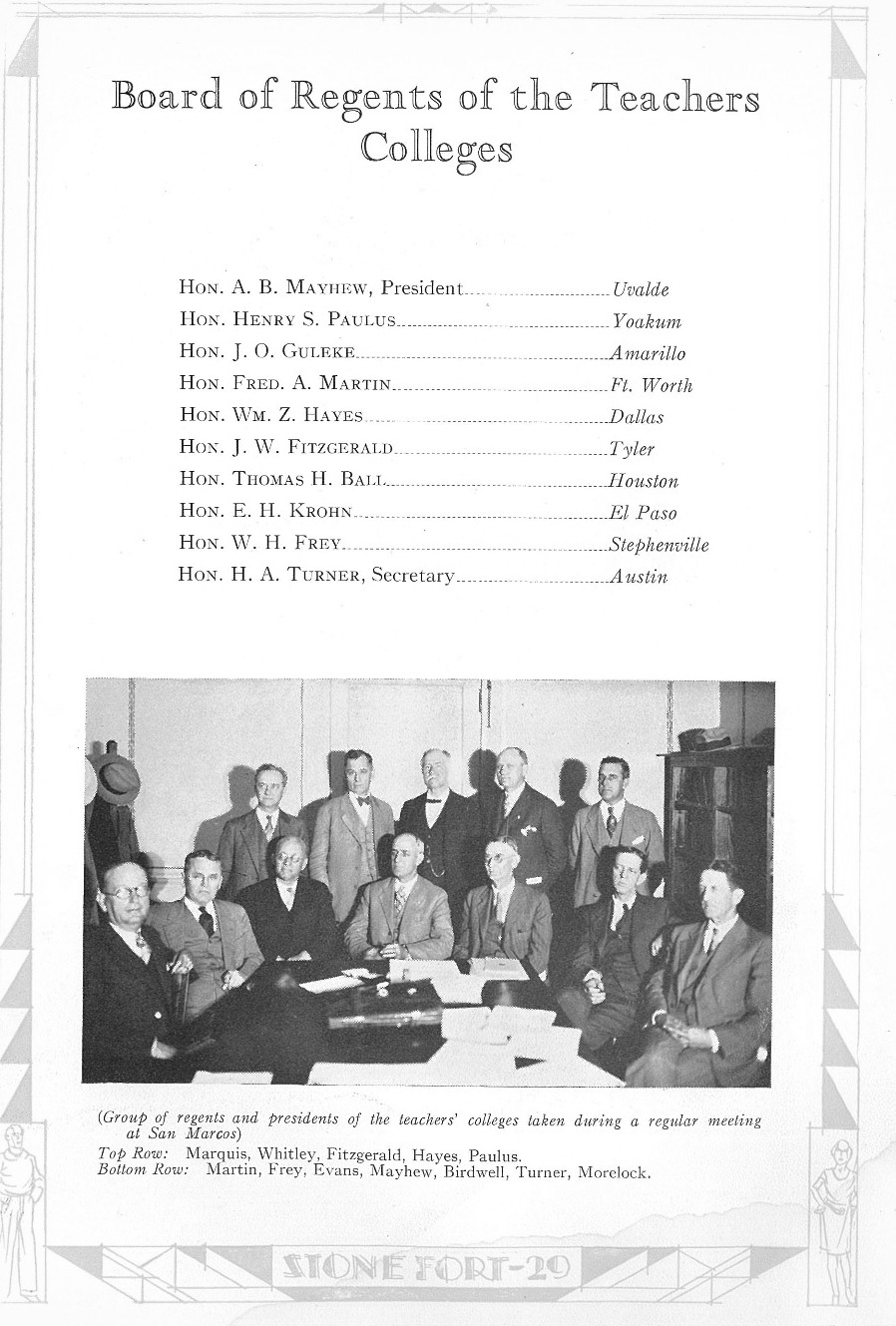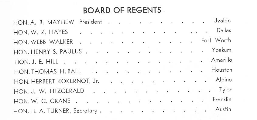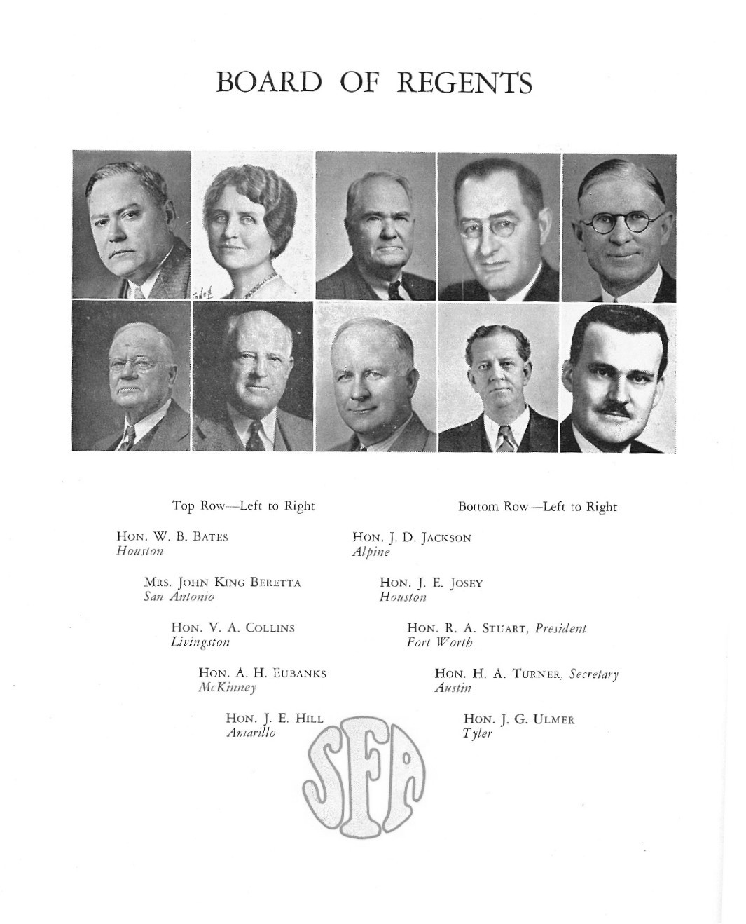 [Editor's Note: There is repitition in the lists for the specific years; the dates of the appointments of the members are on the website at the Texas State University System. The reason for listing the members of each year below is to link them to specific events or photographs at SFA.]