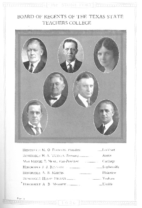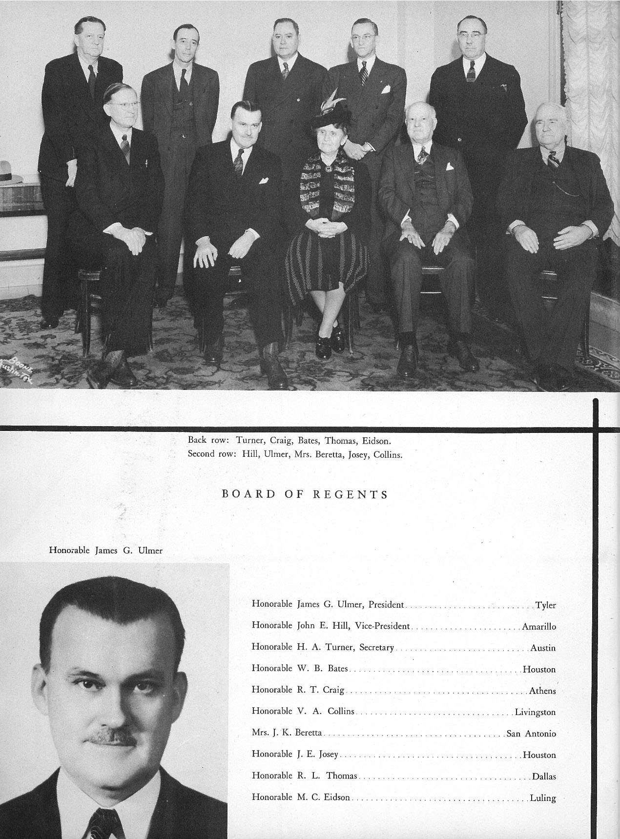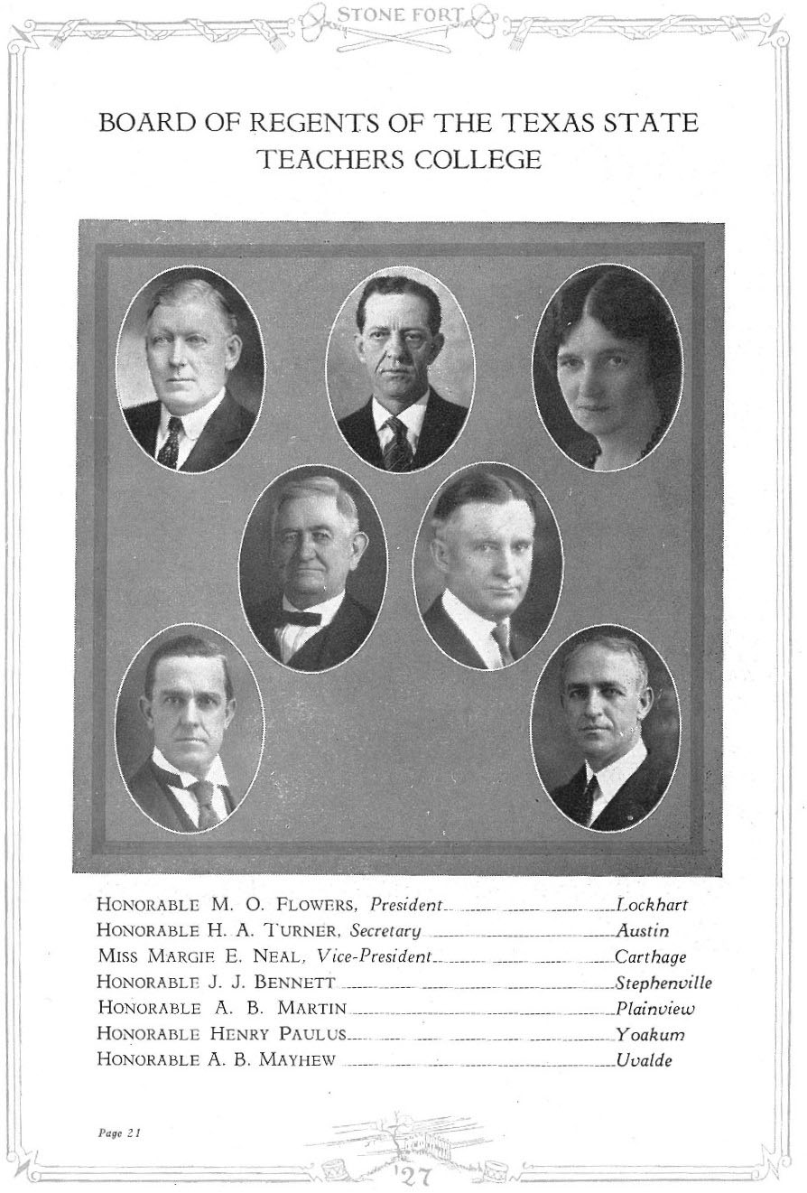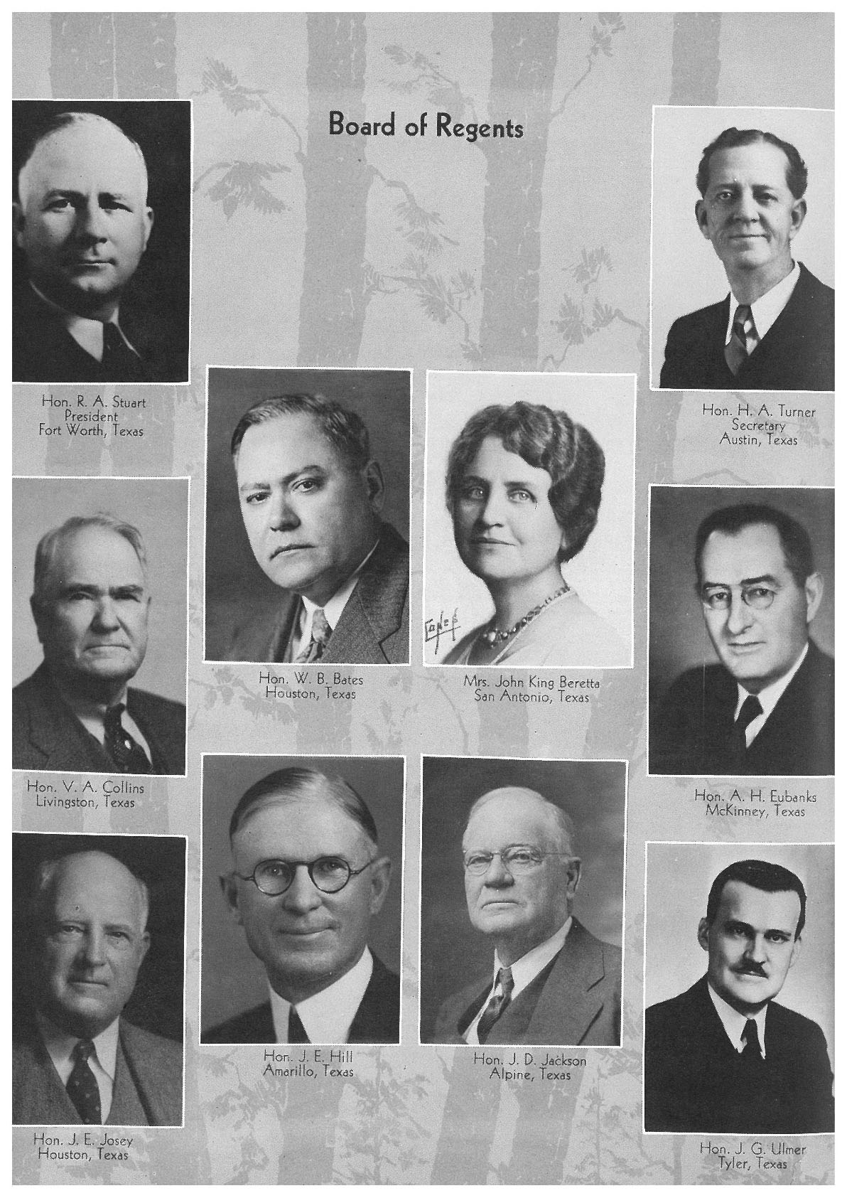[Editor's Note: There is repitition in the lists for the specific years; the dates of the appointments of the members are on the website at the Texas State University System. The reason for listing the members of each year below is to link them to specific events or photographs at SFA.]